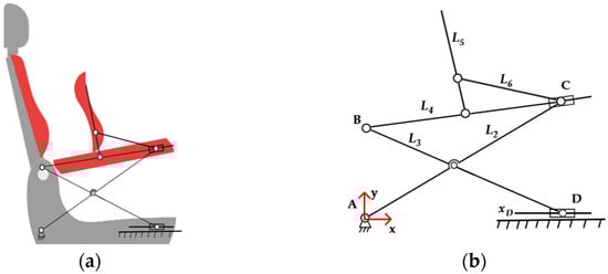 As previous work by [26] implements a proposed design, two interlocking four-bar mechanisms with a sliding guide are used, and it is divided into two sections. This car seat mechanism is composed of a pair of four-bar mechanisms that are interlocked through a linear actuator. This seat mechanism is shown in Figure 9.