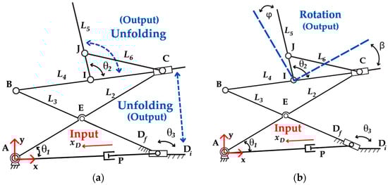 The input is the motion of the linear actuator, and the outputs are the unfolding movement of links and and the trajectory B and C points, which are in blue in Figure 13b. Each link is shown as the seat mechanism unfolds and lifts, as shown in Figure 13b.