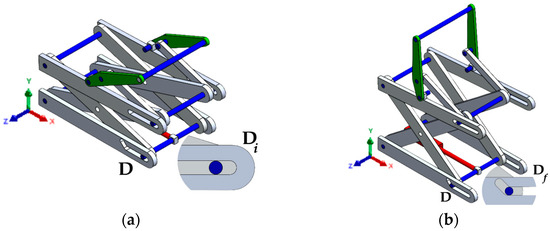 Figure 7 shows a set of two mechanisms: one is a scissor-type mechanism and the second consists of four bars and is powered by two motors. This proposal can be discarded due to the use of two motors at point D and the and the lack of rotation in and .