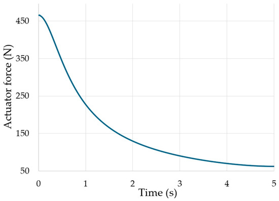 Figure 17 shows an initial value of Newton’s force of 465 N, which decreases to a constant force of 65 N. This is the force required to move the car seat mechanism for a child restraint system up to a height of 20 cm in point C and keep the mechanism in static equilibrium at an interval of 5 s. This indicates that the mechanism initially experiences a progressive decrease in the linear actuator forces to make the mechanism lift.