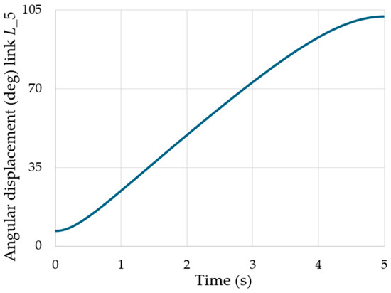 Two simulations are performed to validate and characterize the operation performance. The first simulation is for the lifting movement and unfolding operation, as shown in Figure 13b. The inputs and outputs of the mechanism are identified in point P for the linear actuator. In the first case, the unfolding operation, the inputs and outputs of the mechanism are determined for the first simulation, where links and are lifted and unfolded, as shown in Figure 13b. The mechanism moves to a height of 200 mm in 5 s at point c and 100° at link . The sizes are according to the requirements.