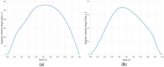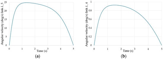 Figure 20 and Figure 21 show the angular velocity and angular acceleration during the simulation of the first mode. In Figure 20a in the backrest, link has a parabolic performance, and the maximum angular velocity is 25 . In Figure 20b in the seat pan, link has the same performance as Figure 20a, and the maximum angular velocity is 0.97 . These are low velocities for the deployment of the seat mechanism for a child restraint system.