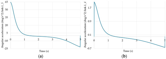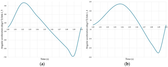 Figure 28a,b show the angular acceleration during the second mode of the simulation. The performance is the same in both plots. In Figure 28a in the backrest, link has a maximum angular acceleration of 568 around 1.02 s and a negative acceleration of 662.5 around 1.09 s. In Figure 21b in the seat pan, link has a maximum angular acceleration of 212 around 1.04 s and a negative acceleration of 328 around 1.09 s. The mechanism performs high accelerations and decelerations at a time of 0.1 s with angular changes of direction, which are characteristic of rotating mechanisms. This performance demonstrates a design that focuses on rapid response to unexpected situations, such as impacts. The ability of the mechanism to control acceleration variation is essential when positioning the infant.
