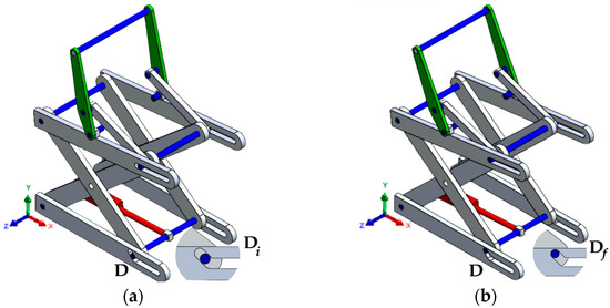 Figure 11 shows a mechanism that has the two required displacements. An electric actuator powers the mechanism. It has two integrated mechanisms: the first mechanism is a scissor-type mechanism, and the second mechanism is a sliding link-guiding crank.