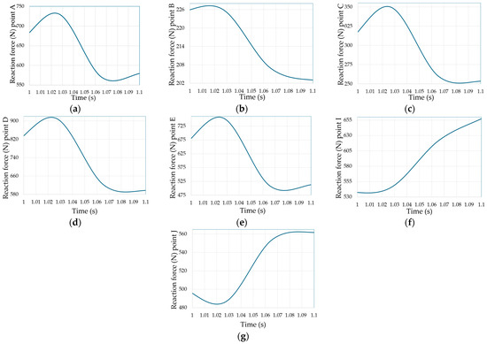 The reaction forces indicate the internal loads on the links and joint points of the mechanism. The reaction forces at joint points A, B, C, D, E, I, and J in Figure 13 of the mechanism should be evaluated for force concentrations that may cause failure. The computed result during the simulation in Figure 23 is shown. In Figure 29, the performance is the same in Figure 29a–g. Table 8 shows all data acquired. Point D shows the maximum reaction force in Figure 29e and the minimum reaction force in Figure 29b.