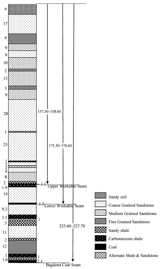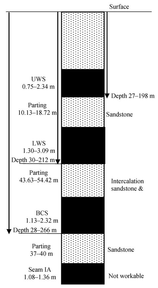 Four coal seams, namely, Upper Workable Seam (UWS), Lower Workable Seam (LWS), Bagdona Coal Seam (BCS), and Seam IA, have been established by drilling in the Tawa-I Underground Mine. The variation in thickness of different seams and their intervening parting, as encountered in different boreholes, is mentioned in Figure 1 and Figure 2.