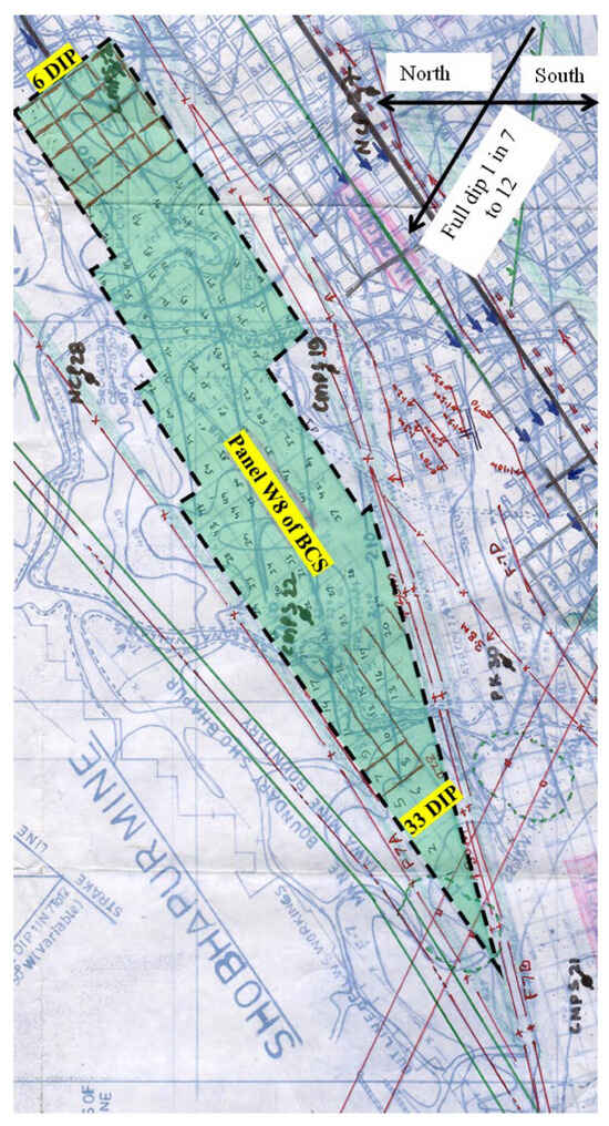 Depillaring operation in the panel needs a preparatory arrangement for the widening of galleries by cutting the sides of the pillar using CM for its easy maneuverability and adaptability and advanced installation of geotechnical instruments. A Shale roof of varying thickness of 3–5 m is present above the coal seam in the panel. A fault with a 1.5 m throw is running from 4 Dip to 13 Dip between 63L and 64L (Figure 3) and is further surrounded by two major faults. The panel is lying below a panel that had been depillared with the caving-in LWS at an average parting of 50 m. A maximum subsidence of 1.6 m has been reported to date in the Tawa-I mine in the panel E2 section of the LWS. The maximum angle of the draw has been observed up to 11° in the E6 district of the LWS, which was depillared 11 years ago. The geo-mining conditions of the panel are mentioned in Table 1. A number of developments have been made for the design of geotechnical elements [1,2,3,4] involved in working with Continuous Miner Technology. Furthermore, researchers have also investigated methods to effectively manage the challenging cavable roof.