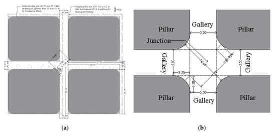 Existing galleries of 3.8 m need to be widened for adaptability of the CM (Figure 4a) by cutting the sides of the coal pillar measuring 35.7 m × 31.2 m (corner-to-corner). Considering the extent of spalling, frequency of slips/joints/discontinuities present in the panel, and available case studies of mechanized depillaring (MD) panels using CM Technology in different coalfields of India, it is proposed here to widen the 3.8 m width of the gallery to 5.5 m only. It is suggested to extract the sides of the pillars of 1.70 m in an L-shaped manner for efficient utilization of the CM in the panel. The extraction of the sides of the coal pillar will reduce its size from 35.7 m × 31.2 m (corner-to-corner) to 34.0 m × 29.5 m (corner-to-corner). Furthermore, it will also reduce the strength of the pillar. Considering the length of the machine to be 11.9 m, it will be difficult for the CM to turn around the junctions of the 5.5 m width of the gallery. A diagonal length of around 10.50 m is required around the junction for turning the entire length of the CM; therefore, it is also proposed here to reduce the corners of the pillar as shown in Figure 4b. Around 10.68 m of diagonal length will be available after the extraction of corners around the junction, which provides a sufficient turning radius for the movement of the CM. It has also been found that the sharp 90° corners become rounded ultimately due to induced stress-driven spalling. The suitability of the 5.5 m width of the gallery has also been simulated in numerical models and found to be appropriate, which is presented in the section on Numerical Modeling.