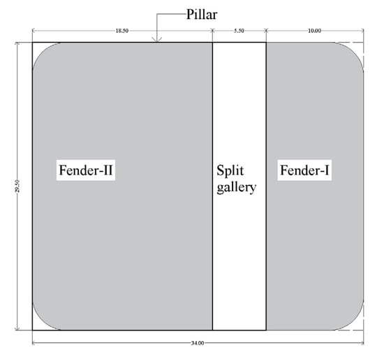 The Tributary Area Method [18] is used to calculate load over pillar and fender. The formation of a pillar by driving galleries all around disturbs the state of virgin stresses, keeping the total magnitude of the overlying strata weight γH constant. It is normally assumed that the entire weight overlying a tributary area is supported by solid pillars. The stress on pillar (P) is estimated using the Tributary Area Method as given in Equation (3).