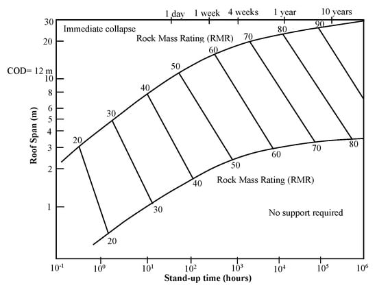 Bieniawski [18] used the Rock Mass Rating (RMR) developed by Bieniawski [19,20,21] for stand-up time and unsupported span of roof (Figure 6). The Coal Mine Roof Rating (CMRR) developed by Molinda and Mark [22] was used to design cut-out distances in US underground mines. Bauer [23] suggested an empirical formulation (Equation (4)) to design cut-out distance based on the Coal Mine Roof Rating (CMRR), the width of the gallery, and depth.