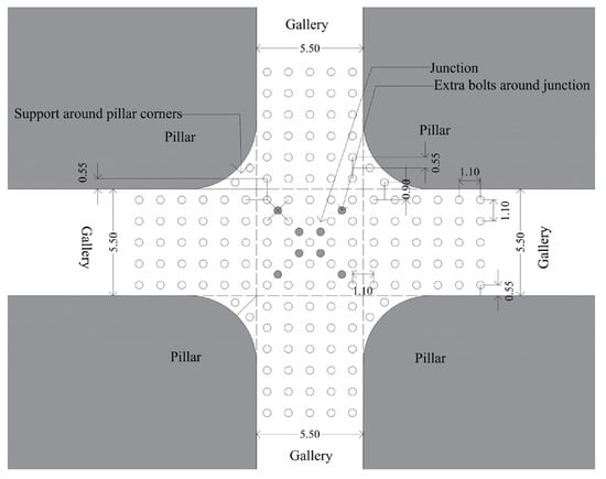 The immediate roof of the panel was examined during the field visit and found to be competent and dry. The pillars, of 39.5 m × 35 m (center-to-center), with galleries of 3.8 m, are being developed by drilling and blasting in combination with LHD for hauling and belt conveyor for the transportation of coal to the surface. The pillars were found to be intact, and there were no observations of side spalling during the field visit. Furthermore, there was no evidence of water seepage from the roof, and the shale in the roof was found to be intact within the panel during the field visit. The bearing capacity of the resin-grouted roof bolt and RMR were found to be 10 t (in 8 h) and 50.40, respectively. Rock load, support resistance, and SSF are estimated for gallery and junction using Equations (8)–(11) for suitable support design (Table 4) of developed workings of the panel by drilling and blasting. Further, it was proposed to widen the existing galleries from 3.8 m to 5.5 m; therefore, the roof bolt pattern for such widened galleries and junctions is mentioned in Table 4 and shown in Figure 9.