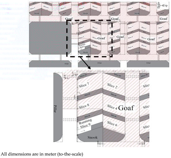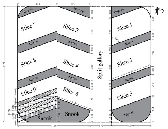 The splitting of pillars is to be performed only one pillar in advance of the pillar under extraction, considering the safety of the work. A sequence of driving of split and slice galleries mentioned in Figure 11, is to be followed during the MD operation. Considering the safe COD value, the split gallery is to be driven in three cuts as first, second, and third sequences of 10 m, 10 m, and 9.5 m, respectively, in each length of cut (Figure 7).