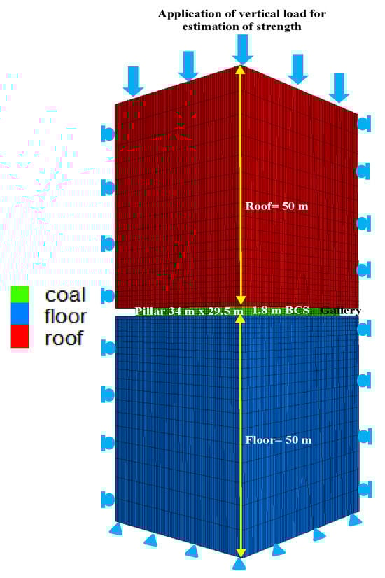 The upper face of the model is fixed for the estimation of the strength of ribs/snooks, with the application of a standard calibrated velocity applied in the vertical direction (Figure 17) after developing galleries. Displacements in the vertical and horizontal directions are fixed at the bottom, and four vertical symmetrical planes of the model are constrained, which are considered boundary conditions during the numerical modeling. The standard size of the model is tested during the numerical modeling, considering the limitations of the computational memory and runtime requirements; 50 m of the roof and 50 m of the floor are modeled with a 1.8 m coal seam in the panel (Figure 17). A coal seam of 1.8 m thickness is considered a strain-softening model, while the roof and floor are treated as elastic constitutive models. In situ stresses are developed in the model before studying the effects of the mining operations. It is carried out to redistribute the stresses in the model and equilibrium conditions are reached, replicating the actual site conditions. Excavation operations are carried out in the model and equilibrium conditions are reached for the estimation of strength. Vertical displacement of the top of the model is fixed and a velocity is applied in the vertical direction for estimation strength of the coal pillar. This entire process is a simple replication of the laboratory testing of rock samples in uniaxial conditions. Average vertical stress-displacement curves are plotted. The numerical model considered the material properties at 266 m depth of cover for the panel. Mohr–Coulomb Strain-Softening (MCSS) parameters have been calibrated for coal seam (Table 6) by matching the in situ stress generated in the model with the actual site and pillar strength as per Sheorey (1992).