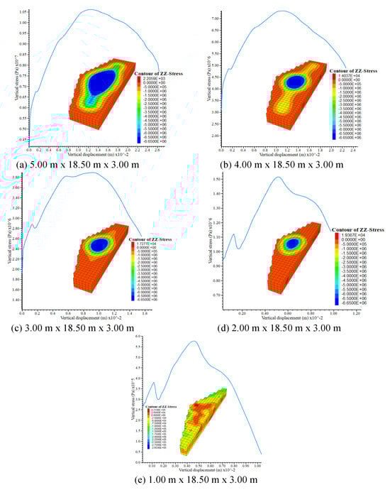 Three layers of roof, coal, and floor are considered for the simulation as the strength of rib/snook has been found to be independent of the nature of the roof. The inputs for the rock mass properties of roof, floor, and coal are mentioned in Table 6. Different sizes of the rib/snook varied during the simulation, as the manner of pillar extraction is shown in Figure 10. The variation in the strength of different sizes of rib/snook simulated in numerical models for the panel is shown in Figure 18. The depth and progress of extraction of coal pillar induce fractured zones in the rib/snook due to standing goaf, resulting in a decrease in their strength. Therefore, the numerical simulation strength of rib/snook formed during pillar extraction is found to be different from the empirical formula strength. The strength estimated using simulation studies is found to be useful in estimating their FOS. Kumar [2,3] found that a limiting FOS of rib/snook of 0.30–0.35 is sufficient for temporary support during the slicing operation. Furthermore, such rib/snook fail in a controlled manner without inhibiting roof fall. Here, rib/snook size of 3.00 m × 18.50 m × 3.00 m (area of 81.60 m2, equivalent width of 7.62 m, and width-to-height ratio of 4.23) is proposed to be left during MD operation, which may be further reduced up to 2.00 m × 18.50 m × 3.00 m (area of 71.60 m2, equivalent width of 6.86 m, and width-to-height ratio of 3.81) due to side spalling of pillars based on limiting FOS of 0.30–0.35.