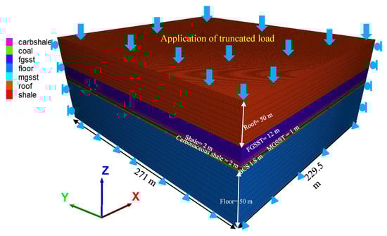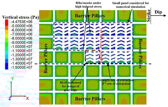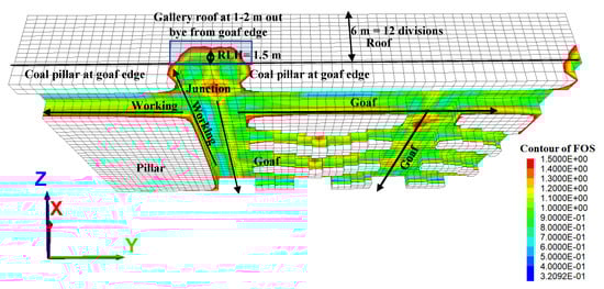 The geometry of the generated model is 229.5 m, 271 m, and 102 m along the length (x-axis), width (y-axis), and height (z-axis), respectively, including 50 m floor (Figure 19), considering the hardware constraint (memory and runtime) of a computer. This model is incorporated with the existing geo-mining conditions and rock mass properties. The thickness of the coal seam considered in the model is 1.8 m, developed and depillared to full height. A truncated load (0.025 MPa/m × 214 m) is applied over the top of the model for the left-out unmodelled roof of 216 m. The width of original/split galleries is kept at 5.5 m, respectively. The bottom and four side walls of the model are fixed, while the top one is kept free as boundary conditions. The properties of rock mass used in the models are collected from the mines and tested in the laboratory, as mentioned in Table 7. Initially, the in situ model is developed as per the abovementioned geometry at a depth of 266 m, followed by the development of pillars and galleries, as per BPMM. This model is then depillared following a straight line of extraction (Figure 20). The height of the rock load to be supported by the roof bolt is estimated for the development and depillaring operation. Here, RLH is defined as the height of the roof strata up to the safety factor contour value of 1.0 in the model, which needs artificial support. RLH is measured at different locations, which is shown in Figure 20 and Figure 21. Support design for the panel on the basis of numerical modeling study is given in Figure 9. RLH is measured at a distance of 1.0 m outby from the goaf edge (Figure 21) without using applied support in the model, which is found to be 1.5 m (3.75 t/m2). SSF of the proposed support plan at the goaf edge is found to be 2.50 for an applied support resistance of 67.87 t/m2, considering the dynamic effects at the goaf edge.