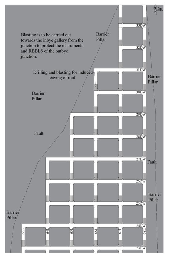 Furthermore, the actual shape of the panel is asymmetrical (Figure 3) right from the start of 33DW. In the initial three rows of the panel, there is only one pillar width (33DW-31DW); thereafter, two rows of two pillars (31DW-29DW), and then two rows of three pillars (29DW-27DW). There are four pillars in the next three rows (27DW-24DW), and thereafter the actual width of five pillars (271 m) is found from 24DW. The width of the panel is an important factor for the occurrence of caving in the goaf. Roof fall will not take place in the panel during the initial five rows of pillar extraction, even after a roof span of 8700 m2 or more due to insufficient panel width (33DW-29DW). The first main roof fall is expected to occur during or after the extraction of the pillar in 29DW-28DW.