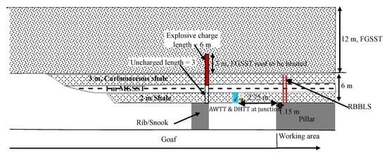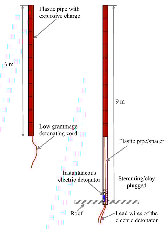 Considering the geo-mining conditions of the panel, roof blasting of up to 9 m thickness includes 2 m shale, 1 m medium-grained sandstone, 3 m carbonaceous shale, and 3 m of fine-grained sandstone roof horizon, which is required to induce fracturing in the rock mass to facilitate regular caving. Roof blasting may be conducted around the junction toward the barrier pillar right from the start of pillar extraction, as shown in Figure 22. In order to induce fractures in the roof horizon, a vertical blast hole of up to 9 m of 42 mm diameter is to be drilled toward the inby of the junction in the goaf to avoid any sort of damage to RBBLS and instruments installed at junctions, as shown in Figure 23. Details of the drilling pattern and explosive charging are shown in Figure 24 and Table 8. Six blast holes should be drilled in a row at a distance of 0.25 m from the adjacent edge of the pillar and at a distance of 1.0 m from each other. Additionally, they should be directed toward the inby of the junction in the goaf to ensure the efficacy of RBBLS and remote observations of instrument readings. Drilling and charging at the junctions should be completed before they shift into goaf. The blast hole is to be charged with a 32 mm diameter of explosive cartridge and a 6 mm detonating cord together, using plastic spacer pipes of 40 mm outer diameter, 38 mm inner diameter, and 6 m in length. The proposed method of charging blast holes is given in Figure 25.