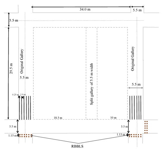where H is the depth of cover (266 m), and R is the RMR (50.40). Using the above equations, RLH is found to be 3.41 m at 0 m outby, 2.68 m at 1 m outby, and 2.04 m at 2.0 m outby from the goaf edge. It is not possible to use a 2 m length of roof bolts, considering the 1.8 m average thickness of the coal seam. Based on the equations and extent of spalling up to 1 m of the pillar present at the goaf edges, RLH at 1.15 m outby from the goaf edge has been used for the design of breaker line support at the goaf edge, which is shown in Figure 11. It is proposed here to install two rows of (seven bolts in each row) roof bolts of 1.70 m length at 0.75 m grid pattern located at a 1.15 m outby from the goaf edge (corner of the pillar facing the goaf line) along the middle position of the rib/snook for safe MD of the panel, as shown in Figure 11. Another two similar sets of RBBLS are to be installed in a row along the midrib in the original/split galleries. It should be mentioned that the practice of RBBLS will enhance efficiency and reduce the cost and cycle time. The normal practice of installing 1.5 m lengths of bolts should be avoided at the location of RBBLS. The design of RBBLS has also been studied on numerical models and results have been validated with the empirical formulation, presented in the numerical simulation section.