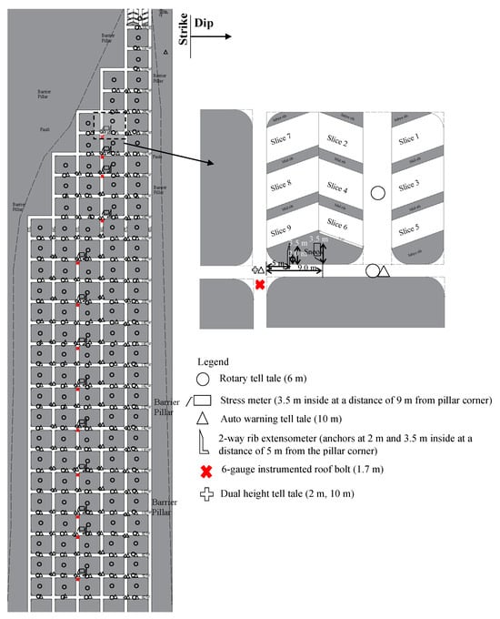 It should be noted here that extra caution is needed while correctly installing the different geotechnical instruments before commencement of MD operation. An attempt is to be made to monitor the readings of the instrument installed in the active mining zone (AMZ) frequently. Actions to be taken during depillaring operation on the basis of roof displacement are shown in Table 9. Details of the instruments proposed to be used for strata control monitoring in these panels are mentioned in Figure 26. Considering the panel for CM-based mechanized depillaring at this mine, extra caution has been taken to maintain safety during pillar extraction by the installation of a series of geotechnical instruments at suitable locations and comprehensive monitoring.