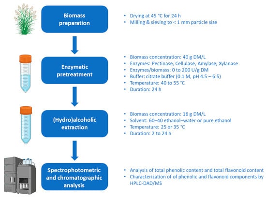 - Extraction after enzyme treatment: biomass concentration of 16 g DM/L. Temperature of 25 or 35 °C. Solvent: ethanol/water (60:40 v/v) or pure ethanol. Extraction time of 2, 5, or 24 h.