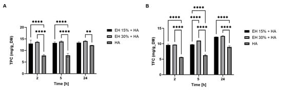 A preliminary analysis of the V. nigrum extracts, in terms of TPC (A) and TFC (B), was assessed by colorimetric assays to compare the yield obtained with different extraction conditions. HA: hydroalcoholic extraction; EH 15% + HA: enzymatic treatment followed by hydroalcoholic extraction (enzyme concentration: 15% by weight of dry biomass); EH 30% + HA: enzymatic treatment followed by hydroalcoholic extraction (enzyme concentration: 30% by weight of dry biomass). Data were analyzed by 2-way ANOVA followed by Tukey multiple comparisons test (** p < 0.01; **** p < 0.0001).