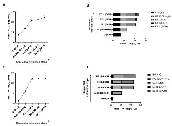 TPC and TFC analyzed by colorimetric assays at each extraction step (A,C), and contribution of the single step (B,D). EH: enzymatic treatment; HA: hydroalcoholic extraction, followed by hydroalcoholic extraction; EE I (EtOH): one cycle of alcoholic extraction; EE II and EE III: additional alcoholic extraction steps.