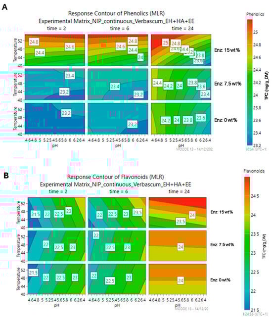 Optimal digestion conditions for the enzymatic extraction step of V. nigrum, using MODDE® software. Four variables were screened (pH, temperature, enzyme concentration and extraction time) and differentially combined. The 4D contour plots display the predicted response values in terms of TPC (mg/g_DM, (A)) and TFC (mg/g_DM, (B)) for each combination. EH: enzymatic treatment; HA: hydroalcoholic extraction; EE: alcoholic extraction.
