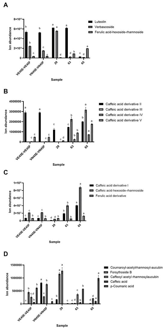 Ion abundance of luteolin, verbascoside and ferulic acid-hexoside-rhamnoside (A) and coumaroyl-acetylrhamnosyl-aucubin, forsythoside B, caffeoyl-acetylrhamnosyl-aucubin, caffeic and p-coumaric acid (B); caffeic acid derivative II, III, IV and V (C); caffeic acid derivative I, caffeic acid-hexoside-rhamnoside and ferulic acid derivative (D) in the V. nigrum extracts. Ion abundance levels of components analyzed through LC-MS/MS were reported as mean values ± SD. Analysis of variance (ANOVA) was carried out through Tukey’s HSD test. Different letters indicate significantly different values (p < 0.05).