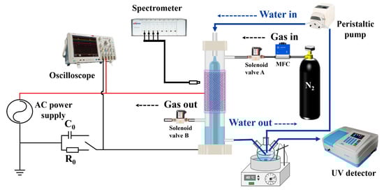 In this experiment, NO2−, NO3−, and NH4+ were considered the main nitrogen fixation products in the liquid phase, which were measured by UV-visible spectrophotometry [22], and comparison with the results of ion chromatography (IC-100, Qingdao ShengHan Inc., Qingdao, China) proved the reliability of the above tests. Standard curves of NH4+ and NOx in the liquid phase products are referenced to Figure S1. Voltage–current curves and Lissajous figures of the WF-DBD were recorded by a digital oscilloscope (MDO3024, Tektronix Inc., Beaverton, OR, USA), and the data were measured by a high-voltage probe and a current probe. The power consumption of the WF-DBD was calculated using the Lissajous method. The spectral information of the WF-DBD was collected and transmitted to the spectrometer (AvaSpec Multi-Channel Spectrometer, AVANTES, Apeldoorn, The Netherlands) via an optical fiber equipped with a fibre-optic collimator (UV-74, AVANTES, Apeldoorn, The Netherlands).