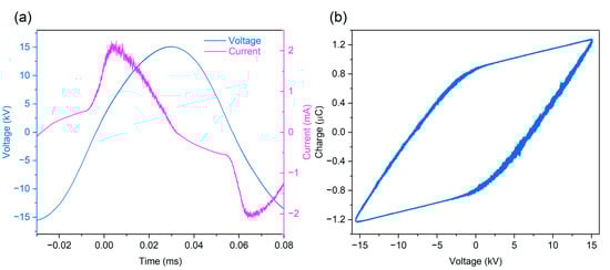 Typical (a) voltage–current curves and (b) Lissajous figure curves. [applied voltage: 31 kV, discharge gas: N2, gas flow rate: 200 SCCM].