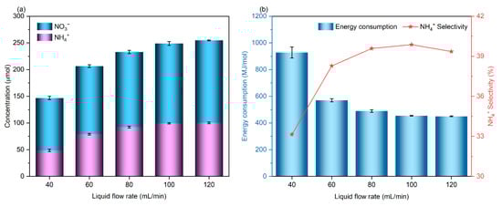 (a) Concentrations of NH4+, NO3−, and NO2− produced in aqueous solutions under different liquid flow rates, and (b) the energy consumption and the selectivity of NH4+.