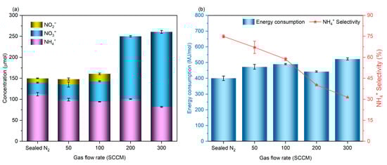 (a) Concentrations of NH4+, NO3−, and NO2− produced in aqueous solutions under different N2 flow rates, and (b) the energy consumption and the selectivity of NH4+.