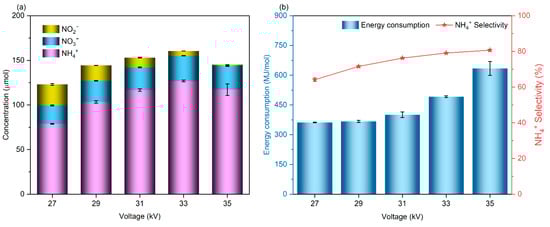 The intensity of the reaction electric field, the plasma discharge power, and the intensity of the plasma–liquid reaction can be influenced by adjusting the applied voltage, and the effect of voltage on ammonia synthesis under sealed gas flow is investigated here. Figure 5 demonstrates the effect of applying different peak–peak voltages on NH4+ and NOx in the liquid phase product. From Figure 5a, the concentration of NO3− in the product initially increases and then decreases with increasing voltage, while the concentration of NO2− continuously decreases. Consequently, the synthesis rate reaches a maximum of 12.69 μmol·min−1 at a peak–peak voltage of 33 kV, with an energy consumption of 491.86 MJ·mol−1. The reason for this may be that increasing the peak–peak voltage of high-voltage alternating current generates more energetic electrons in the electric field, thereby increasing the probability of exciting or dissociating gas molecules, and that excessive voltages may also lead to the decomposition of ammonia and nitrite. However, while increasing the voltage improves the yield, energy consumption also increases. As shown in Figure 5b, the selectivity of NH4+ increases with voltage, reaching 80.7%.