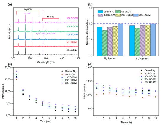 (a) OES of the WF-DBD reactor under sealed N2 and flowing N2 conditions. (b) Normalized relative intensity of the N2 (C → B) and the N2+ (B → X). (c,d) The temporal evolution of the emission intensity of the N2 (C → B) and the N2+ (B → X).