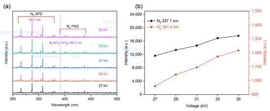 (a) OES of the WF-DBD reactor under different peak–peak voltages. (b) The emission intensity of the N2 (C → B) and the N2+ (B → X) of sealed N2 at different peak–peak voltages.