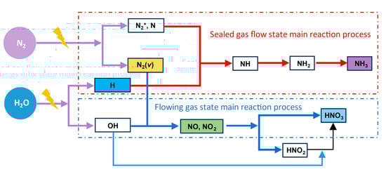 Schematic diagram of nitrogen fixation mechanism in WF-DBD. The main reaction process of sealed gas flow state and flowing gas state.