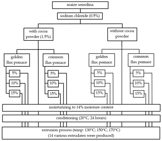 Two types of flaxseed pomace were crushed in a mill (Retsch GM 200; Haan, Germany) to granulate 1 mm ± 0.2 mm. Pomace from golden flaxseed or common flaxseed was added to maize semolina in doses of 0%, 5%, 10% or 15% of mixture dry matter. The range of pomace additives used was selected in previous studies [6]. The mixtures were divided in half, and 1.5% cocoa and 0.5% sodium chloride were added to one half, whereas only 0.5% sodium chloride was added to the second half. The dry matter content of the mixtures prepared in this way was determined and, based on calculations, water was added to the mixture in such a way as to obtain a moisture content of 14%. Afterwards, all samples were closed in polyethylene bags and conditioned at room temperature for 24 h (Figure 1).
