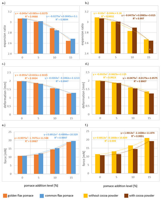 The influence of the type and amount of pomace from flaxseed added on the expansion ratio (a) and mechanical properties of snacks (c,e) and the influence of amount of pomace from flaxseed added and cocoa added on the expansion ratio (b) and mechanical properties of snacks (d,f).