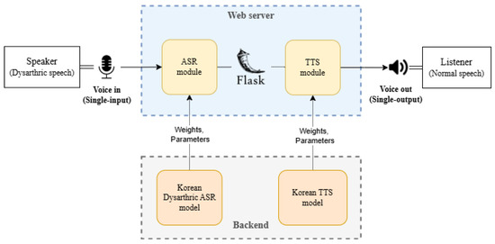 The flow of the entire system starts with the dysarthric speech input captured via a microphone. To process the input speech signal, the ASR and TTS models are modularized by loading the weights and parameters of each model, enabling them to make predictions for a single input on the web server. The ASR and TTS modules are integrated into the web server using the Flask framework of Python3.9. The ASR model processes the captured speech to generate a text output, which is then immediately passed as input to the TTS model. Through this integration, the input dysarthric speech is directly transformed into clear non-dysarthric speech on the web server. As a result, users can interact more smoothly with others in social communication situations using the synthesized non-dysarthric normal speech.