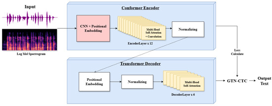 Based on the output obtained through the conformer encoder, the decoder generates the output text sequence. Using the MHSA mechanism, the decoder selectively emphasizes important information from the speech sequence during text generation. In this process, CTC learns the alignment between the output of the encoder and the text sequence, ultimately generating the final output text.