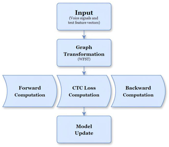 In Equation (8), denotes the set of all possible alignments between and , and represents the probability of a specific alignment . This probability is computed using the GTN graph, which efficiently calculates the probabilities of state transitions. Subsequently, the overall probability is computed by summing the paths in the graph. The model is trained by backpropagating the calculated loss and updating the weights.