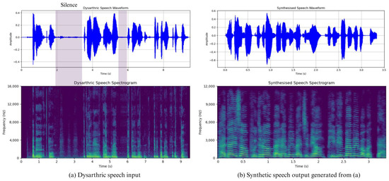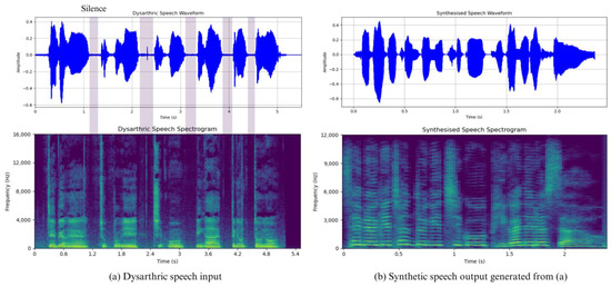 Figure 7 shows a visualization of the Korean dysarthric speech used as input and the synthetic utterance generated by the entire system. In Figure 7a, corresponding to the dysarthric speech, we can see that there are frequent silences in the middle of the utterance. This is due to the nature of dysarthria, which is a speech blockage caused by the dysregulation of the articulatory system during speech, which causes great confusion for the listener in understanding the speech. When such dysarthric speech is fed into a communication aid system, all the silent intervals caused by speech blockages are removed and resynthesized into a natural rhyming utterance, Figure 7b.