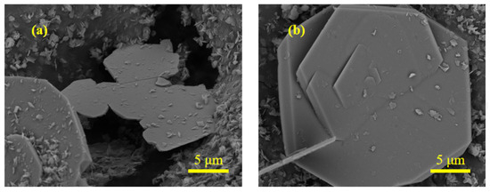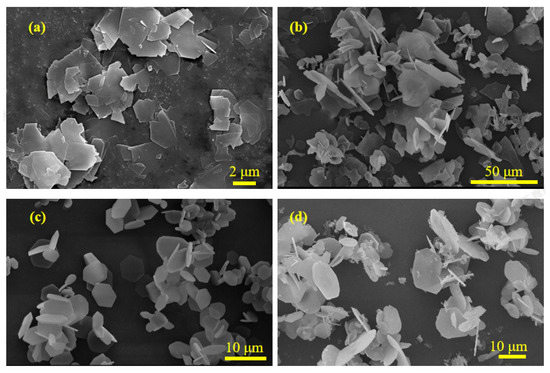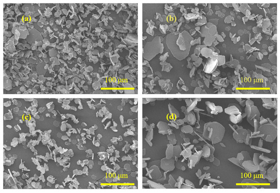 The traditional molten salt technique commonly employs soluble chloride or sulfate salts as fluxes to create a molten environment that facilitates the growth of flaky structures. This study explored the characteristics of sintering aids in the solid-state method and included control experiments with the addition of 1 wt% NaCl, KCl, Na2SO4, and K2SO4 while keeping the proportion of added aluminum fluoride and the calcination temperature at 1100 °C for 4 h constantly. As depicted in Figure 3, in the presence of Cl−, the effects of Na+ and K+ on morphology were nearly negligible. However, when SO42− was present, K+ markedly enhanced the growth and thickness of flaky alumina compared to Na+. The size of flaky alumina with a trace addition of potassium sulfate ranged from 45 to 65 μm, whereas the average size of flaky alumina prepared with sodium chloride or potassium chloride was 15–25 μm. In conclusion, the synergistic effect of SO42− and K+ had a substantial impact on the redevelopment of flaky alumina structures [14].