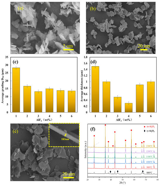 In this section, the condition of maintaining a temperature of 1100 °C for 4 h was considered. As illustrated in Figure 2a, in the absence of AlF3, the flaky boehmite precursor retained its original morphology at 1100 °C, but there were significant changes in particle size and thickness. This could be attributed to the absence of fluoride ions, which led to the lack of gas-phase intermediates, such as Al-O-F, in the sintering environment [13]. Upon the introduction of fluoride ions, the flaky alumina developed fully, as depicted in Figure 2b. No residual morphology of the flaky boehmite was detected under the SEM, and the size of the flaky alumina increased significantly to 10–15 μm, which is 5–10 times larger than the product in Figure 2a. Consequently, the introduction of fluoride ions played a crucial role in the synthesis of large-sized flaky alumina and reduced the phase transition temperature, enabling the production of large flaky alumina with a high α-phase at lower temperatures. As depicted in Figure 2c,d, the particle size of flaky alumina diminishes with escalating concentrations of AlF3, ranging from 1% to 6%, and stabilizes within a specific thickness range. In contrast, the thickness of flaky alumina initially decreases and then increases as the concentration of AlF3 increases. In conclusion, the optimal diameter-to-thickness ratio for flaky alumina is attained with the addition of 4% AlF3.