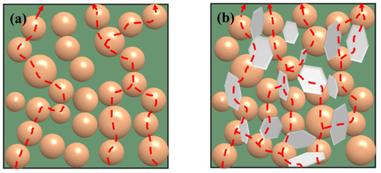 Model diagram of heat-conducting pathways: (a) conventional spherical alumina fillers; (b) spherical and flaky alumina composite fillers.