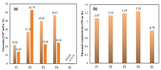 (a) Test viscosity values of flake alumina with different particle sizes (the left value is 1/s viscosity, the right value is 10/s viscosity); (b) thermal conductivity of flake alumina with different particle sizes.