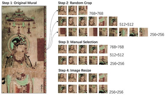 Data preprocessing: Dunhuang murals have many defects of different sizes. These are natural subjects for inclusion in datasets for image restoration. However, mural images captured manually may suffer from perspective deformation at the edges or other defects. Therefore, the collected mural images must be preprocessed before they can be used for model training. The preprocessing procedure involved random cropping and manual filtering of mural images to obtain the training dataset and validation samples. This approach retained the local details and rich textures of the patterns. Figure 1 shows the data preprocessing.