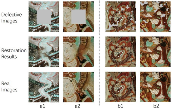 Previous studies have demonstrated that deep learning techniques can be used to restore damaged murals, such as in restoring their color and content [37,38]. However, these studies have not considered different types of mural damage during model training, resulting in restoration models with weak robustness. Our study considered both local and global damage restorations and achieved good restoration results.