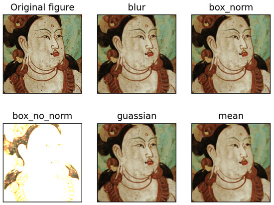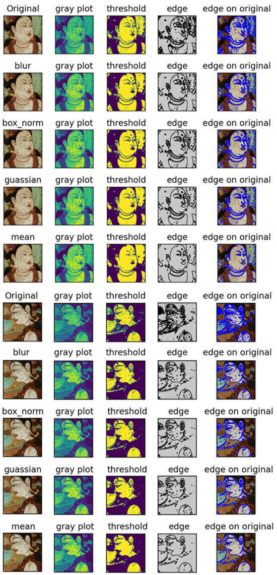 The mural itself may contain noise. The continuous contour extraction of an image can produce many irrelevant contours. Therefore, clear image contours must be extracted to reduce the noise processing of the image. We set different sizes for the convolution kernel and different kernel parameters and used four noise reduction methods to smoothen the image.