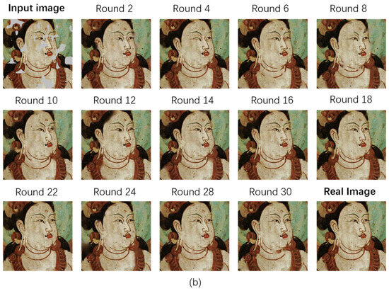 We set the model training to save the parameters of the generator and discriminator every two rounds. For example, 15 generator models are saved after completing 30 rounds of model training. When the model is tested, the images to be restored are transferred to the multiple generator models. Figure 7 shows the restoration results of the models for large defects in the center region and irregular defects in random regions. We arranged the repaired images sequentially according to the training rounds to demonstrate the restoration process.